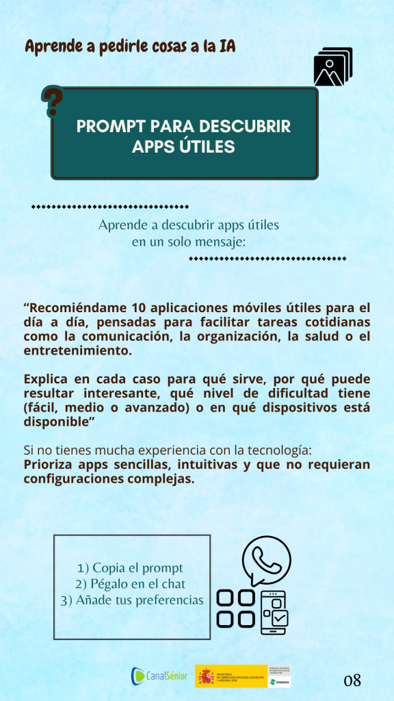 Ahí entran los prompts, que son las frases o instrucciones que escribimos para pedirle algo a la IA; cuanto más claros y completos sean, mejores serán las respuestas. En Canal Sénior queremos ayudarte a manejarte con esta nueva forma de “preguntar” para que puedas aprovechar la tecnología con confianza; por eso hemos creado esta sección de prompts útiles, listos para copiar y pegar, y que iremos actualizando cada dos semanas con nuevas ideas prácticas.